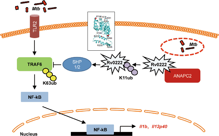 结核分枝杆菌感染引起的结核病至今还是全球十大死因之一,深入理解结核分枝杆菌的致病机制是解决结核病防控的关键。该研究采用了一种创新的、基于功能的筛选,找到了结核菌新的效应蛋白,明确Rv0222可以抑制宿主炎症反应。为结核菌的免疫功能机制研究给予有效且可行的筛选方案。研究发现,结核分枝杆菌的重要毒力因子Rv0222分泌蛋白,只有在被宿主泛素链接酶催化,发生泛素化修饰后,才能招募抑炎蛋白分子,阻断宿主抗结核免疫通路,从而导致结菌从人体免疫系统中成功逃逸而致病。