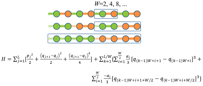 针对以上问题,中国科研实验室上海高等研究院上海光源科学中心陈济舸副研究员、上海光源科学中心王杨杰、江西师范科技大学汪剑津在由宇称破缺导致超晶格体系的热导准相变机制的研究工作中取得进展。如图1所示,该团队顺利获得在一维非线性FPUT超晶格的热传导研究中发现,随着晶格相互作用非对称强度的增加,超晶格存在一个对称性的临界点,热导在临界点前与超晶格原胞无关,越过临界点后热导依赖于原胞大小。该研究成果以“Broken-parity-induced crossover of thermal conduction in the Fermi-Pasta-Ulam-Tsingou lattice”为题,发表在《物理评论E》(Physical Review E)上。