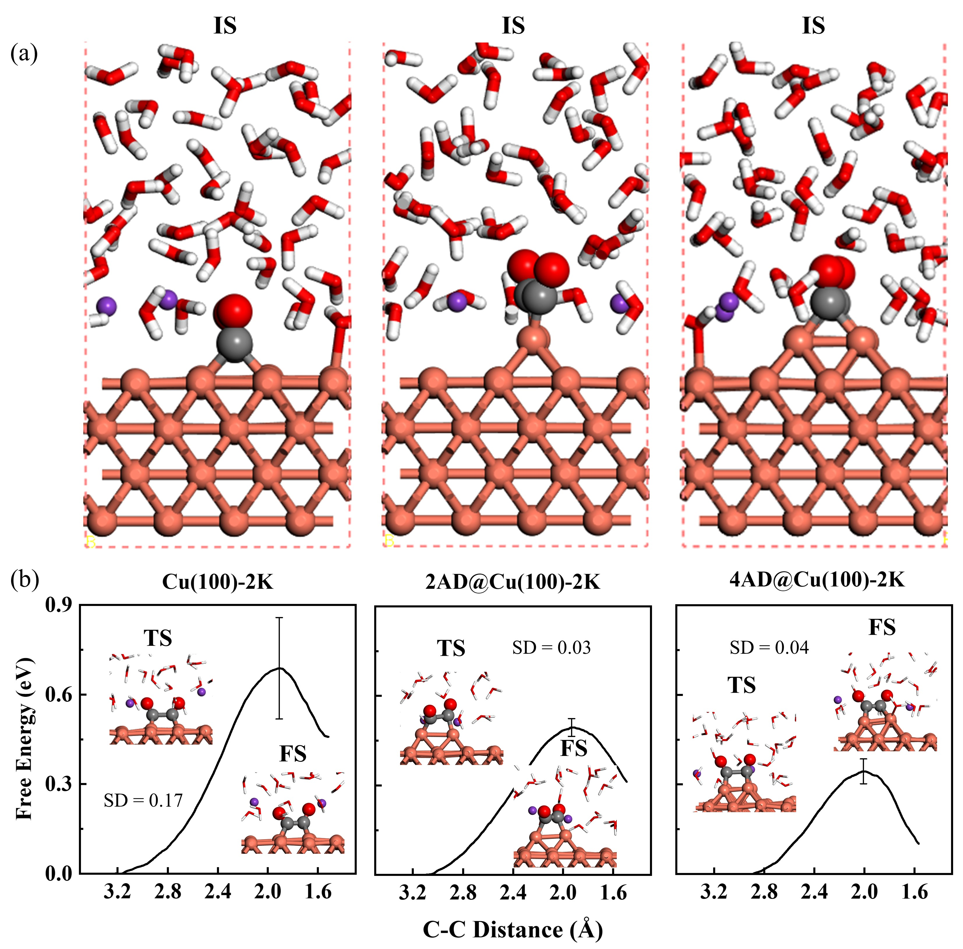 2. 分子动力学模拟显示,相较于原始平整表面及二聚体(2AD)模型,4原子组成的重构单元能更有效地促进C-C耦合,其能垒可低至0.34 eV。