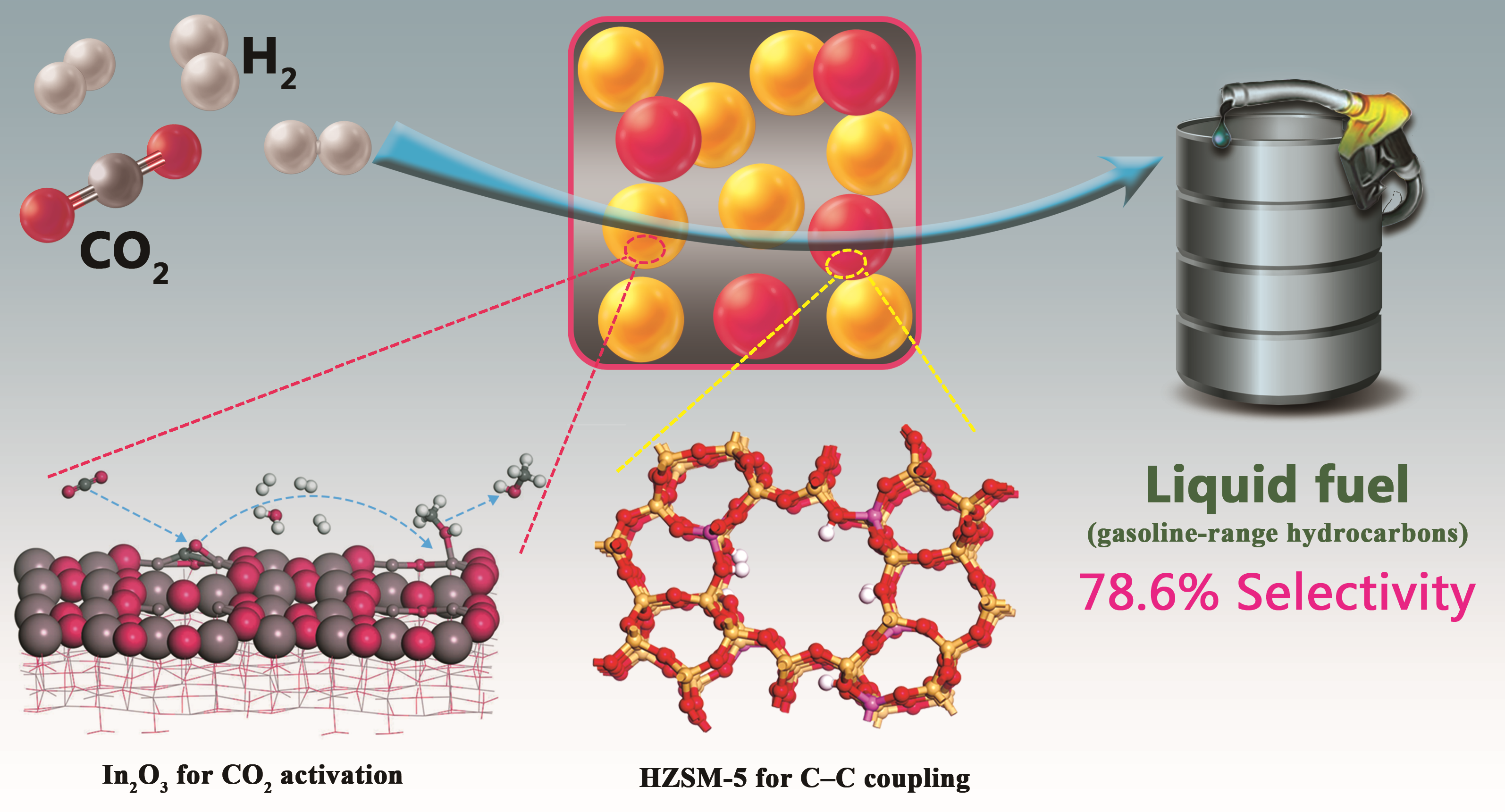 二氧化碳(CO2)是最主要的温室气体,我国作为排放大国正面临严峻的减排压力。中国政府高度重视CO2减排问题,国家主席习近平在巴黎气候大会重申了中国此前做出的承诺,中国将于2030年左右使CO2排放达到峰值并争取尽早实现。这给国内能源结构、产业结构调整带来巨大转型压力,相关技术创新和突破是实现碳排放峰值承诺的重要途径。同时,CO2也是一种自然界大量存在的“碳源”化合物,若能借助替代能源(太阳能、风能、核能等)电解水制得的氢气将CO2转化为有用的化学品或燃料,将同时帮助解决大气中CO2浓度增加导致的环境问题、化石燃料的过度依赖以及可再生能源的存储问题。汽油和航煤等烃类化合物是重要的运输燃料,在世界范围内应用广泛、具有很高的经济价值。著名诺贝尔化学奖取得者Olah教授提出了“人工碳循环” 的概念,若借助替代能源将CO2直接转化为液体燃料可使得整个碳循环更加有效。现在,CO2资源化利用的研究主要集中在甲醇、甲酸、甲烷和一氧化碳等简单小分子化合物的合成,然而,由于CO2分子的化学惰性,很难将其转化为含有两个碳原子及以上的化合物。