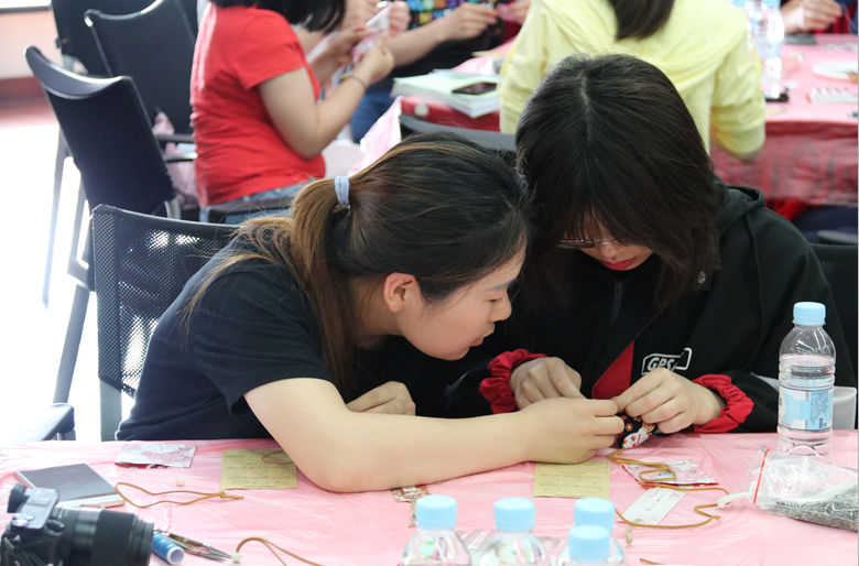 终于到了同学们翘首期盼的制作香囊环节,活动前,高研院学生会的同学们做足了“功课”,早早的就将制作香囊的材料备齐,花色布料、五彩棉线、艾草、薰衣草……各式各样的原材料琳琅满目。活动一开始,大家便迫不及待地忙活起来,剪布料、缝边角、穿珠子、做彩绳……同学们在制作香囊的过程中,还融入自己的创意,不一会儿的功夫,颜色艳丽、款式多样的香囊就在大家的互帮互助中完成了,活动现场弥漫着植物的天然清香,格外沁人心脾。