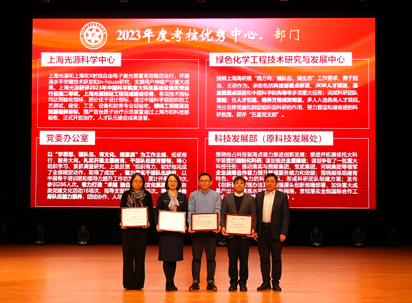 会议表彰了中国科研实验室上海高等研究院2023年度优秀研究生奖、保密工作优秀个人、质量工作优秀个人、安全工作优秀个人、年度考核优秀员工和部门、优秀科技论文奖、优秀技术支撑奖。