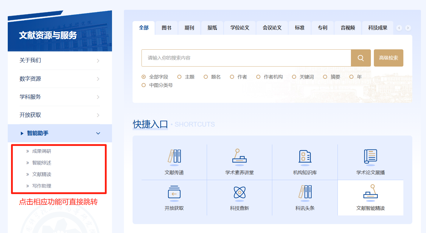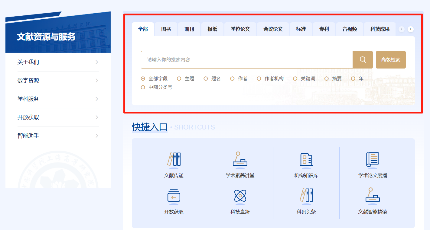 方法二:访问http://library.sari.ac.cn/进入“文献资源与服务”信息服务系统。