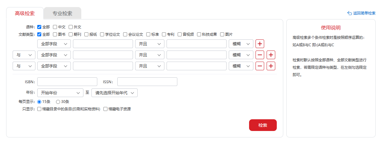 点击高级检索后进入高级检索页面,可以选择对应字段输入检索词进行检索。
